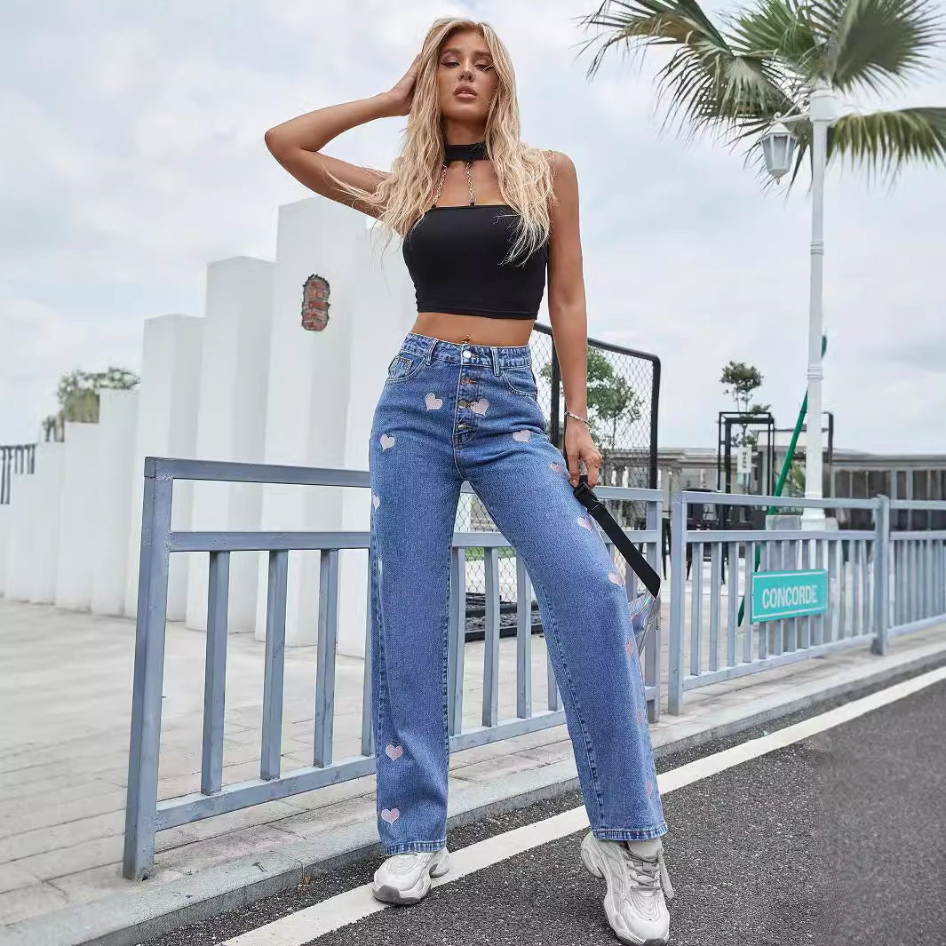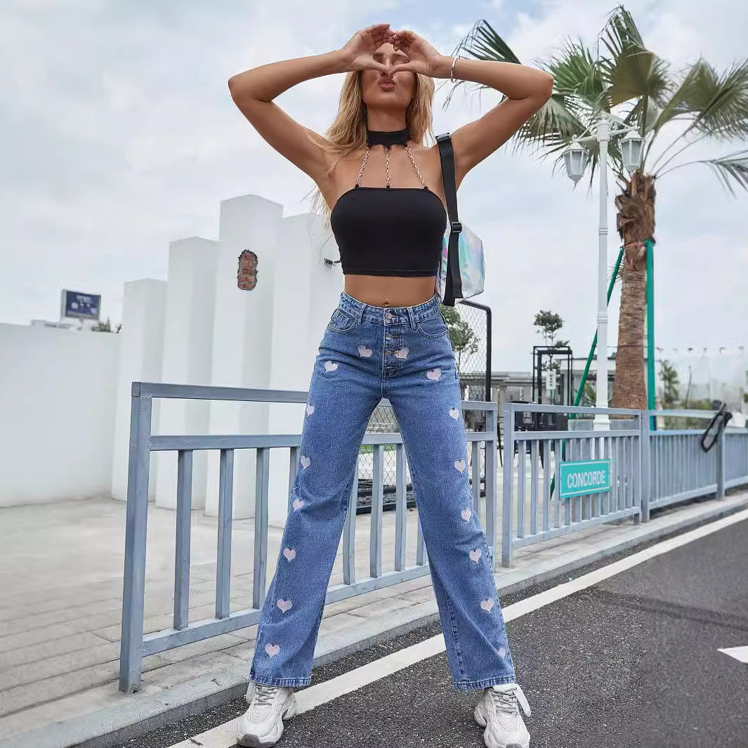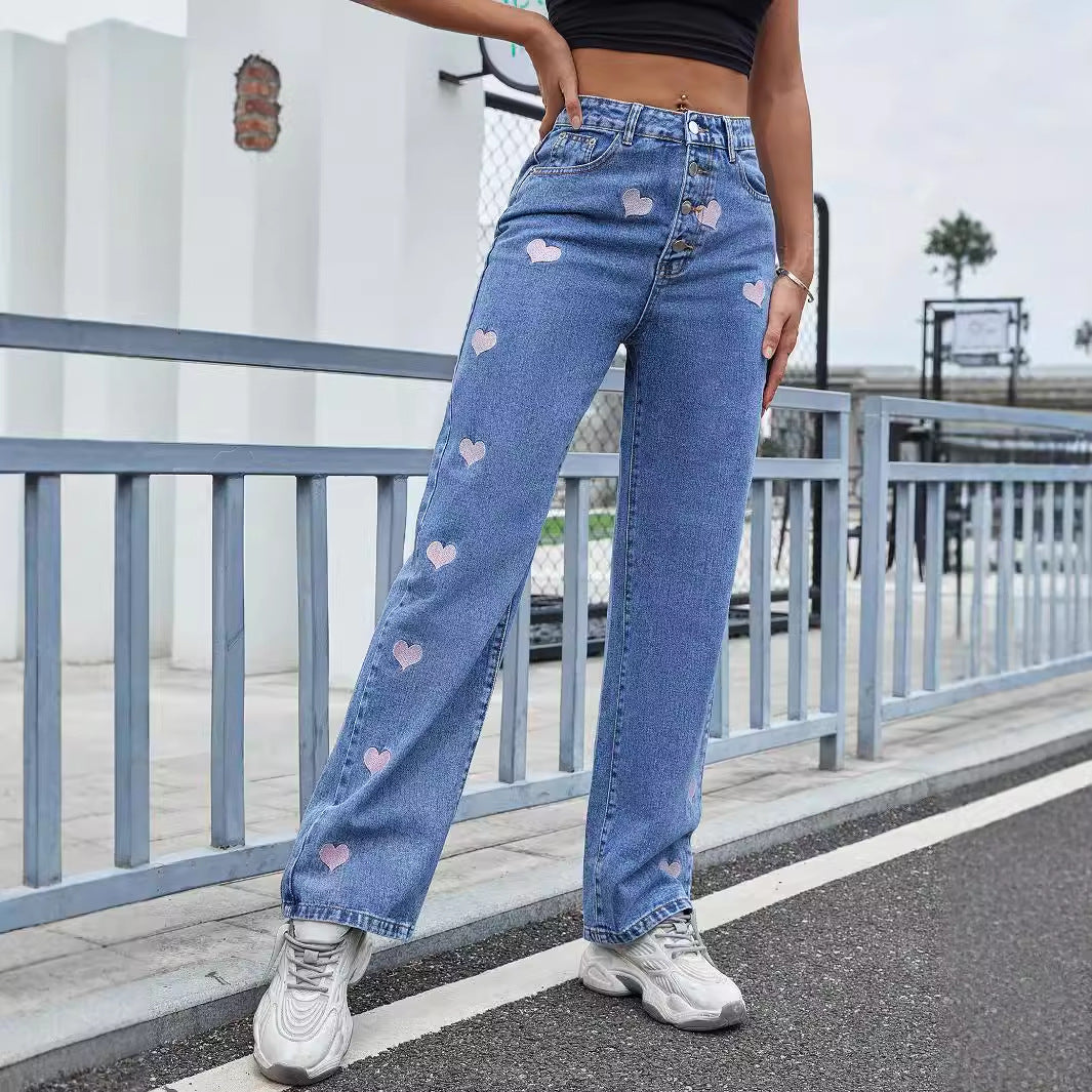 O grande diferencial é o detalhe do bordado "LOVE", que injeta um elemento divertido e moderno ao clássico jeans azul. Ideal para quem adora a praticidade do jeans reto, mas busca uma peça que transmita personalidade. Combine o estilo Casual com o toque romântico do bordado para um look autêntico e trendy.
